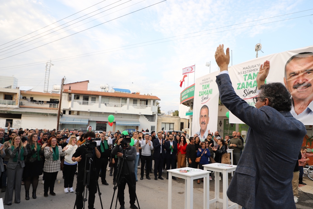 Dr. Süleyman Uluçay’ın konuşmasının ardından kürsüye gelen CTP Genel Başkanı Tufan Erhürman, Mağusa’da kararın verildiğini ve değişim coşkusunun Maraş’a taşındığını vurgulayarak konuşmasına başladı. ERhürman, “Birileri çıkıp bu seçim onlarla bunlar arasında geçecek dedi. Bizi bölüp kamplaştırmaya çalıştıkları yeter” dedi. Erhürman, bu seçimin, bu ülke için, bu halk için, nerede doğmuş olursa olsun bu ülkeyi yurt bilen insanlar için, bu ülkenin çocukları için gaile çekenlerle, çekmeyenler arasında geçeceğini, hizmetten bahsedenlerle hikaye okuyanlar arasında geçeceğini vurguladı.