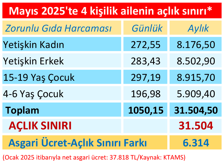 Sendikanın Sağlık Bakanlığı Yataklı Tedavi Kurumları Dairesi ile İstatistik Kurumu verilerini kullanarak yaptığı hesaplamalar net 37 bin 818 TL’lik asgari ücretin, sadece gıdaya dahi ucu ucuna yettiğini gösteriyor. 2025 yılının ilk beş ayında açlık sınırı rakamları asgari ücreti aşmadı ancak, Mayıs ayı itibarıyla asgari ücretin her 100 lirasının 84’ünün gıdaya gittiği hesaplandı. Tek asgari ücretli aile diğer ihtiyaçları için 6 bin 314 TL ile yetinmek zorunda kaldı.