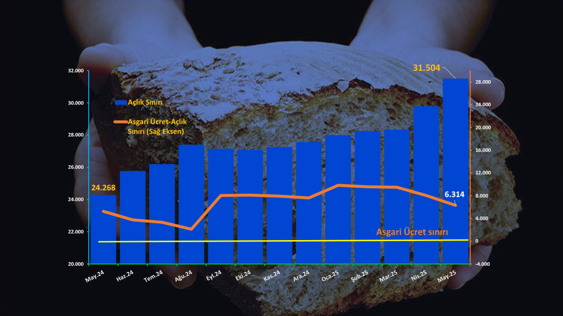 Sendikanın Sağlık Bakanlığı Yataklı Tedavi Kurumları Dairesi ile İstatistik Kurumu verilerini kullanarak yaptığı hesaplamalar net 37 bin 818 TL’lik asgari ücretin, sadece gıdaya dahi ucu ucuna yettiğini gösteriyor. 2025 yılının ilk beş ayında açlık sınırı rakamları asgari ücreti aşmadı ancak, Mayıs ayı itibarıyla asgari ücretin her 100 lirasının 84’ünün gıdaya gittiği hesaplandı. Tek asgari ücretli aile diğer ihtiyaçları için 6 bin 314 TL ile yetinmek zorunda kaldı.