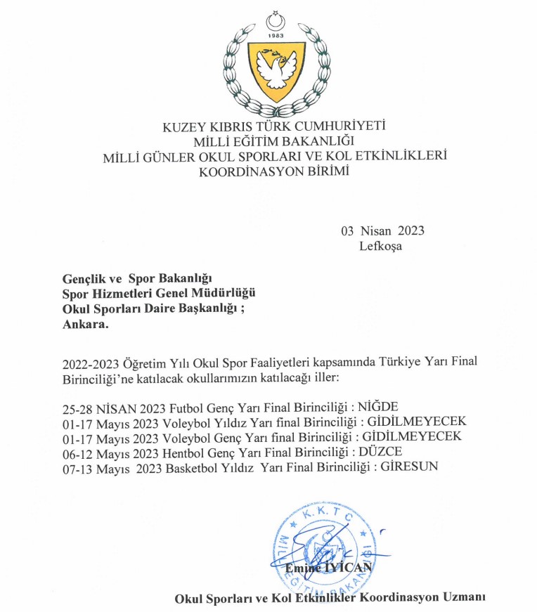 Final Birinciliği müsabakalarına okul takımı göndermeyeceğimizi bildirmiş bulunmaktayız.
