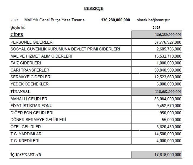 2025 Mali Yılı Merkezi Devlet Yönetimi Bütçe Yasa Tasarısı toplamı 136 Milyar 280 milyon TL olarak öngörüldü. Buna göre: Personel giderleri 37 milyar 776 milyon; Sosyal güvenlik kurumuna devlet primi giderleri, 2 milyar 605 milyon; Mal ve hizmet alım giderleri 16 milyar 532 milyon; Faiz giderleri 1 Milyar; Cari Transferler 59 milyar 840 milyon; Sermaye giderleri 12 milyar 523 milyon; Yedek Ödenekler ise 6 milyar Türk Lirası olarak öngörüldü.