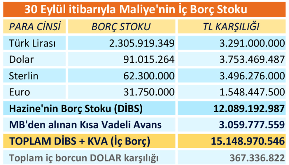 Maliye Bakanlığı’nın 2025’in dokuzuncu ayı sonunda Devlet İç Borçlanma Senedi (DİBS) ve KKTC Merkez Bankası’ndan sağlanan Kısa Vadeli Avans bakiyesi (KVA) yoluyla oluşan toplam iç borç stoku; 15 milyar 149 milyon TL (367 milyon 336 bin dolar) düzeyinde saptanmıştı. Bakanlar Kurulu, Şubat’ta, Maliye Bakanlığı’na 6 milyar TL borçlanma yetkisi” vermişti. Ancak, 11 Şubat-24 Eylül arasında tam 26 kez iç borç alan Maliye, 21,4 milyar liradan fazla borç yazdı.