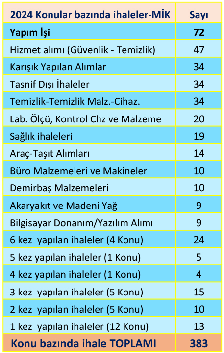 MİK’in 2023’te açtığı ihalelerde ilk sırayı 58 kez çıkılan “tasnif dışı” ihaleler alırken, piyasaya para sağlayan, katma değeri yüksek “yapım işi” ihalelerinin 22 ihaleyle arka sıralarda kalması dikkat çekmişti. Ancak, 2024’te “Konular bazında” açılan ihalelerde ilk sıraya 72 ihaleyle yine “Yapım işi” ihaleleri yerleşti. Verilere göre, 47 ihaleyle “güvenlik ve temizlik hizmet” alımı ikinci sırada geliyor. MİK’in listesinde üçüncü sırada 34’er ihaleyle “karışık yapılan alımlar”; “tasnif dışı ihaleler” ile “temizlik, temizlik malzemeleri ve temizlik cihazları alımı ihaleleri” görülüyor.