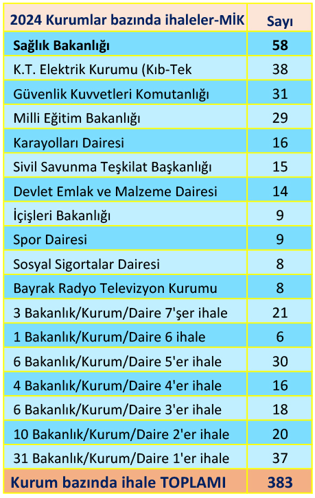 MİK’in “Kurumlar bazında” açtığı ihalelerin ilk sırasında 58 ihale ile Sağlık Bakanlığı yer alıyor. “Konular bazında” açılan ihalelerin ilk sırasında ise 72 ihale ile “Yapım işleri” var. MİK’in açıkladığı ihalelerde sayı bakımından ikinci sırayı 38 ihaleyle Kıbrıs Türk Elektrik Kurumu, üçüncü sırayı da 31 ihaleyle Güvenlik Kuvvetleri Komutanlığı aldı. Milli Eğitim Bakanlığı 29 ihaleyle kendine dördüncü sırada, Karayolları Dairesi 16 ihaleyle beşinci sırada ve Sivil Savunma Teşkilat Başkanlığı da 15 ihaleyle altıncı sırada yer buldu.