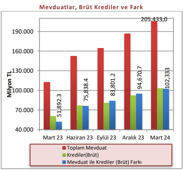 Merkez Bankası raporunda 2024’ün ilk çeyreği sonunda toplam mevduat 205 milyar 233 milyon TL; toplam brüt krediler ise 98 milyar 916 milyon TL seviyesinde olduğu belirtilirken, bir yıllık dönemde brüt kredilerin toplam mevduata oranının 3,69 puan azaldığına yer verildi. Veriler, toplam mevduat ile brüt krediler arasında Aralık 2023 sonunda 94 milyar 670,7 milyon TL olan farkın, Mart 2024 sonunda 7 milyar 662,3 milyon TL arttığını ve 102 milyar 333 milyon TL’ye yükseldiğini gösteriyor.
