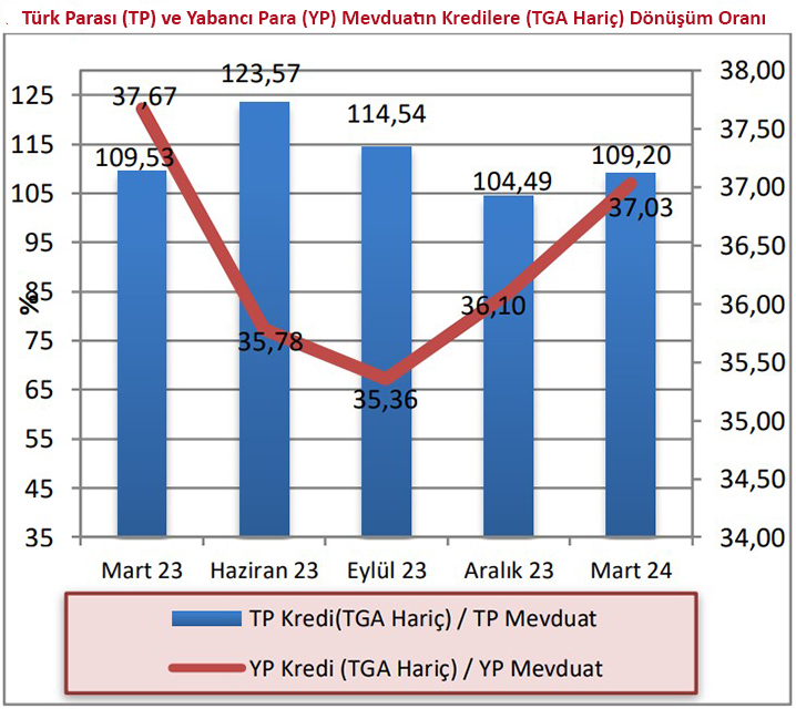 Merkez Bankası raporuna göre, Türk Parası (TP) mevduatın krediye dönüşüm oranı, Yabancı Para (YP) mevduatın çok üzerinde. TP mevduatın, tahsili gecikmiş alacaklar (TGA) hariç TP krediye dönüşüm oranı Mart 2024 itibarıyla bir önceki çeyreğe göre %104.49’dan %109.2’ye; YP mevduatın TGA hariç YP krediye dönüşüm oranı ise %36.1’den %37.03’e yükseldi. TP ve YP mevduatın krediye dönüşüm oranı 2023 yılı Mart ayında sırasıyla %109.53 ve %37.67 oranında gerçekleşmişti.
