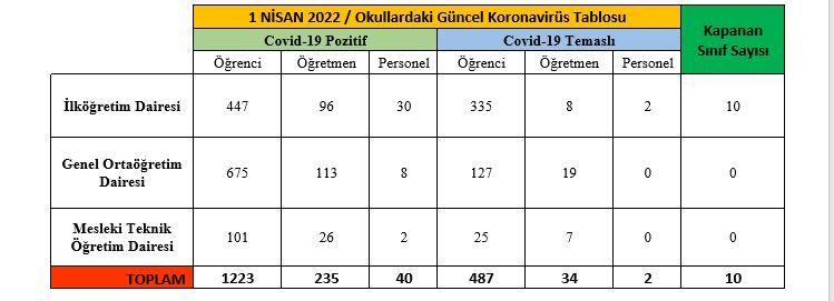 Milli Eğitim Bakanlığı, okul idarelerinden gelen bilgiler doğrultusunda okullardaki güncel vaka sayılarını açıkladı.