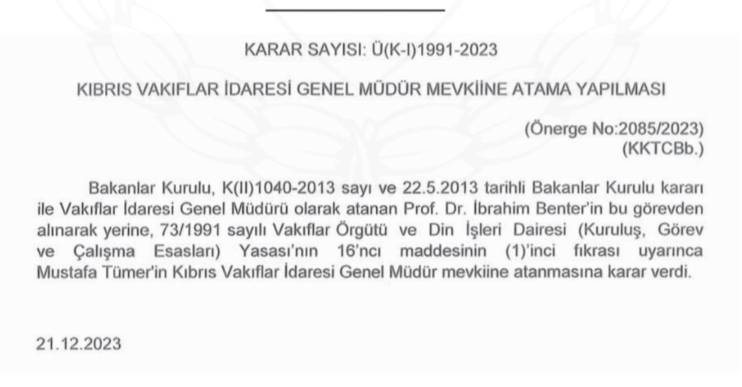 Bakanlar Kurulu kararıyla görevden alınan Vakıflar İdaresi Genel Müdürü İbrahim Benter’in yerine jet hızıyla atama yapıldı. Benter’den boşalan Vakıflar İdaresi Genel Müdürlüğü görevine, kısa bir süre önce DAÜ Rektör Vekili olarak görev yapan Prof. Dr. Mustafa Tümer atandı