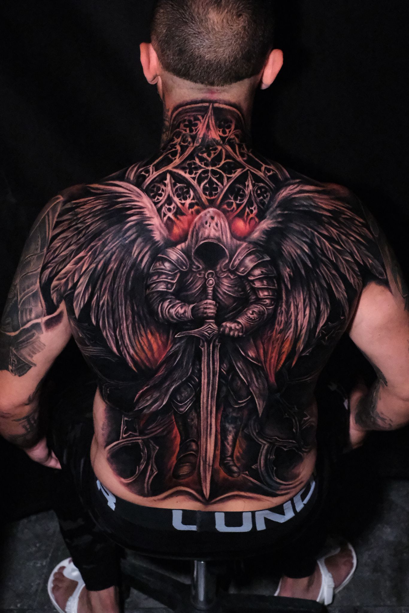 Toplam beş dövme sanatçısından oluşan ekip, yaklaşık 9 saat süren bir çalışmayla müşterinin sırtına kapsamlı bir dövme uyguladı.