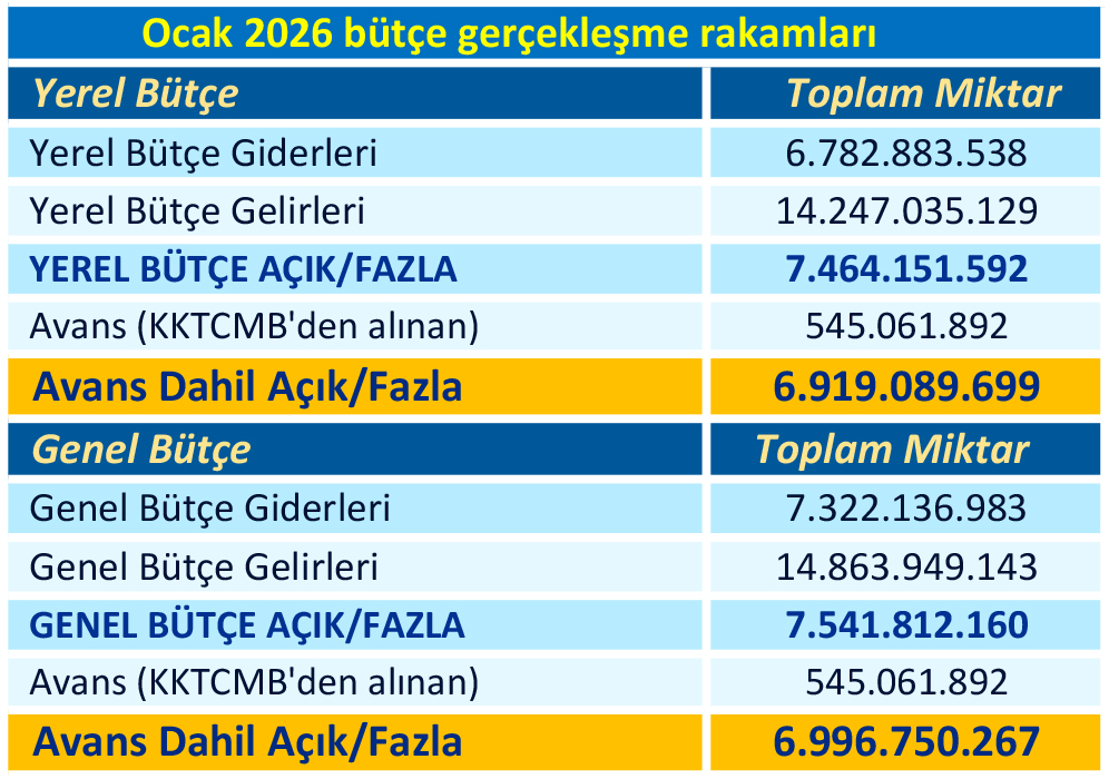 KKTC Maliyesinin Ocak 2026 yerel bütçe fazlası 7,4 milyar lira; genel bütçe fazlası ise 7,5 milyar lira düzeyinde açıklandı. Ancak, KKTC Merkez Bankası’ndan sağlanan 545 milyon liralık “avans” sonrasında bütçe fazlası, 6,9 milyara geriledi. Verilere göre, Ocak ayında yerel gelirler 14,2 milyar, yerel giderler 6,8 milyar lira; genel gelirler 14,8 milyar, genel giderler ise 7,3 milyar lira oldu.