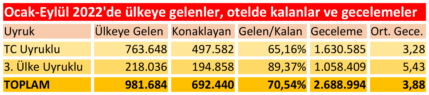 OTELDE 3,8 GECE KALIYORLAR… Otellerdeki uyruklara göre gecelemelere bakıldığı zaman ise geçen yıla göre %362’lik artış görülüyor. Ocak-Eylül periyodunda konaklama sayısı ile geceleme sayısı incelendiğinde üçüncü uyruklu kişilerin TC uyruklulara kıyasla otellerde çok daha uzun süre kaldığı görülüyor. Yaptığımız hesaplamalara göre turistler otellerde ortalama 3.88 gece kalıyor. Üçüncü uyruklular otellerde ortalama 5.43 gece konaklarken, TC uyruklular ortalama 3.28 gece kalıyor.
