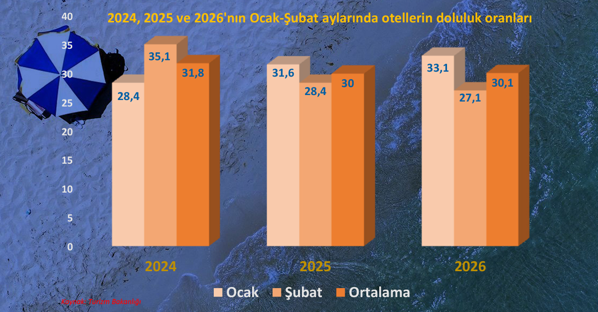 Veriler, Ocak 2026’da doluluk oranının %33.1 düzeyinde olduğunu gösterirken, geçen yılın aynı ayına göre %4.7’lik bir artış saptandı. 2025’in ilk ayında bu rakam %31.6 oranındaydı. Şubat ayında ise turistik konaklama tesislerinin ortalama doluluk oranının %4.6 oranında gerilediği hesaplandı. Geçen yıl %28.4 olan ortalama doluluk oranı, bu yıl %27.1 oranına geriledi. Turizm çevreleri Ramazan dolayısıyla Şubat ayının ikinci yarısında yaşanan durgunluğun doğal olduğu fikrinde.