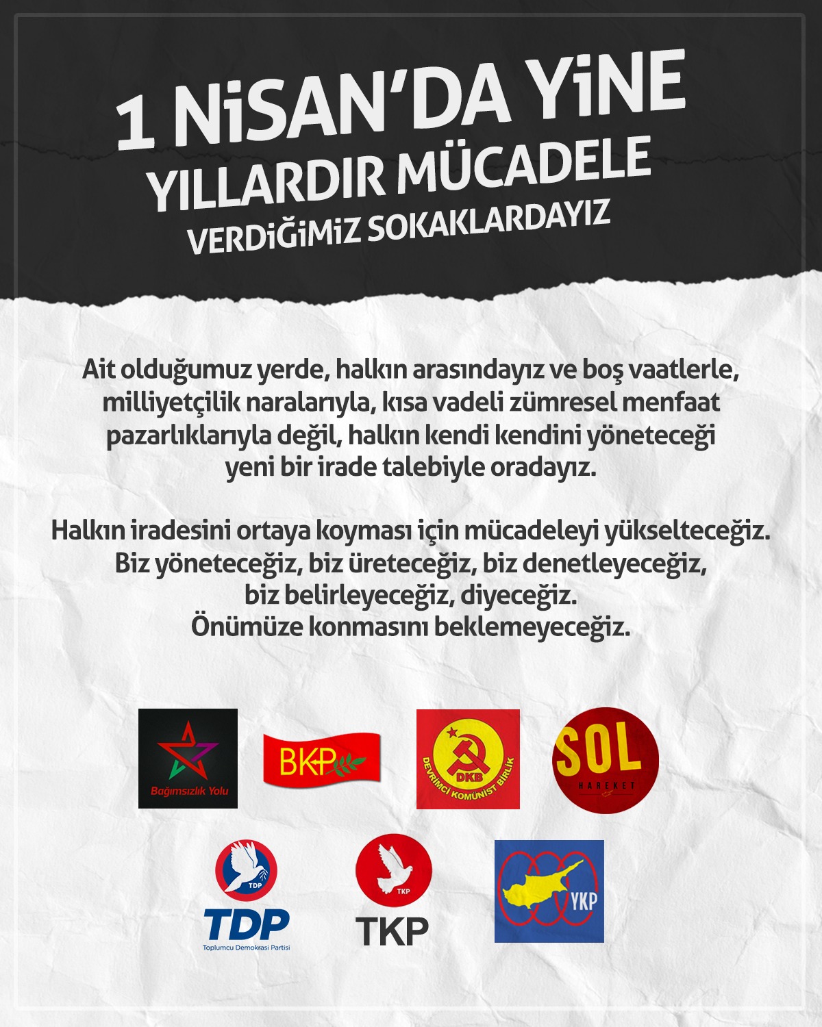 1 Nisan’da yine yıllardır mücadele verdiğimiz sokaklardayız. Ait olduğumuz yerde, halkın arasındayız ve boş vaatlerle, milliyetçilik naralarıyla, kısa vadeli zümresel menfaat pazarlıklarıyla değil, halkın kendi kendini yöneteceği yeni bir irade talebiyle oradayız.