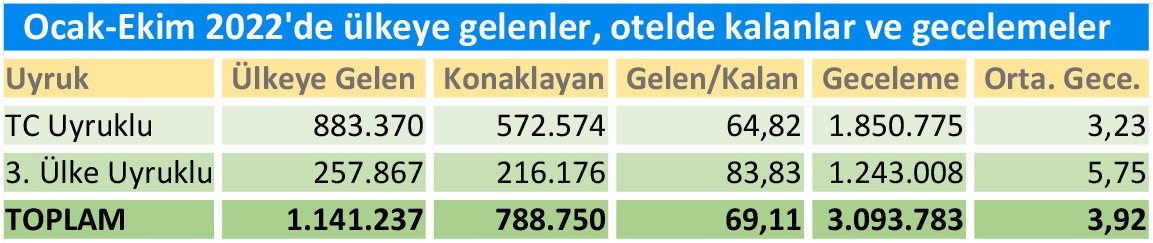 Turizm Bakanlığı’nın verilerine göre, 10 aylık sürede Türkiye’den Kuzey Kıbrıs’a gelen 883 bin 370 kişinin %64,82’si (572 bin 574) otelde kalırken, geriye kalan 310 bin 796 kişi (%35,18), ülkede “statüsüne” (öğrenci, görevli, kaçak) göre konakladı. Ocak-Ekim döneminde gelen 257 bin 867 üçüncü ülke vatandaşının %83,83’ü (216 bin 176) otelin yolunu bulurken, Eylül ayında %89,37 olan bu oranın ciddi düzeyde gerilediği dikkati çekti. Üçüncü ülke vatandaşlarının 41 bin 691’i (%16,17) de “diğer alternatiflere” yöneldi. Otellerde kalmayanların %88.17’lik kısmının ise Türkiye’den gelenler olduğu kayıtlara geçti.