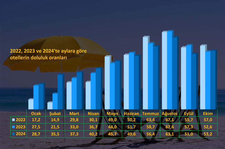 Turistik konaklama tesislerinin Ekim ayındaki doluluk oranı %53.2 düzeyinde açıklandı. Turizm Bakanlığı’na bağlı Turizm Planlama, İstatistik ve Araştırma Dairesi’nin verilerine göre, otellerin 10 aylık doluluk oranı ortalaması ise %46.2 seviyesinde saptandı. Ekim ayındaki doluluk oranı geçen yılın aynı ayına göre %1.14 oranında artarken, 2022’nin %6.7 oranında gerisinde kaldı. Ekim aylarındaki doluluklar 2023’te %52.7; 2022’de ise %57 seviyesinde kaydedilmişti.