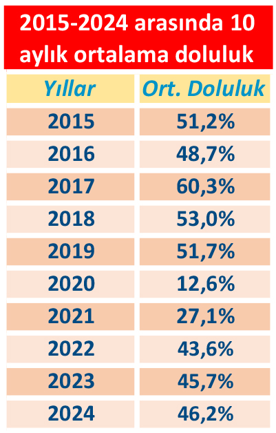 Ocak-Ekim 2024’ün ortalama doluluk oranı son 5 yılın en yüksek seviyesine ulaşmasına rağmen %46.2 ile yine %50’nin altında kaldı. Bu yıl yükseliş olmasına rağmen 2015-2019 arasındaki 5 yıllık periyoda fazla yaklaşamadı. 2017 yılındaki %60.3 oranındaki ortalama doluluk son 10 yılın rekoru olarak dikkati çekerken, Covid-19’un etkisinde geçen 2020 ve 2021’de (pandemi yılları) dibe vurduğu görülüyor. Doluluklar bu yıllarda sırasıyla %12.6 ve %27.1 seviyesinde açıklanmıştı.