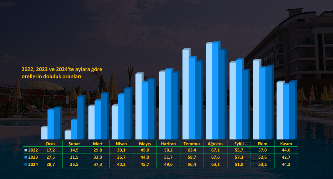 Veriler, otellerin aylık bazdaki doluluk oranının Ekim’den sonra Kasım’da mevsimsel etkilere bağlı olarak düştüğünü gösteriyor. Kasım 2024’te doluluk oranı bir önceki Ekim ayına kıyasla düşerken; 2023 yılının aynı ayına kıyasla arttı. Ancak, turizm çevreleri, Kış ayları ile ilk ilkbahar ve sonbahar aylarında doluluk oranlarında artış olmasına rağmen, yaz aylarındaki sert düşüşlere dikkati çekti. Haziran, Temmuz, Ağustos ve Eylül aylarındaki doluluk oranlarının 2022 ve 2023’ün gerisinde kaldığını söyleyen turizmciler, yaz turizmi konusundaki endişelerini dile getirdi.