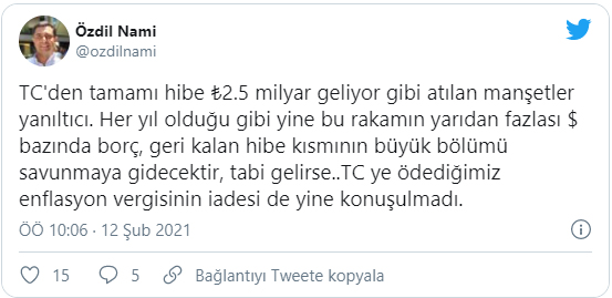 “TC’den tamamı hibe ₺2,5 milyar geliyor gibi atılan manşetler yanıltıcı. Her yıl olduğu gibi yine bu rakamın yarıdan fazlası $ bazında borç, geri kalan hibe kısmının büyük bölümü savunmaya gidecektir, tabi gelirse..TC ye ödediğimiz enflasyon vergisinin iadesi de yine konuşulmadı.”