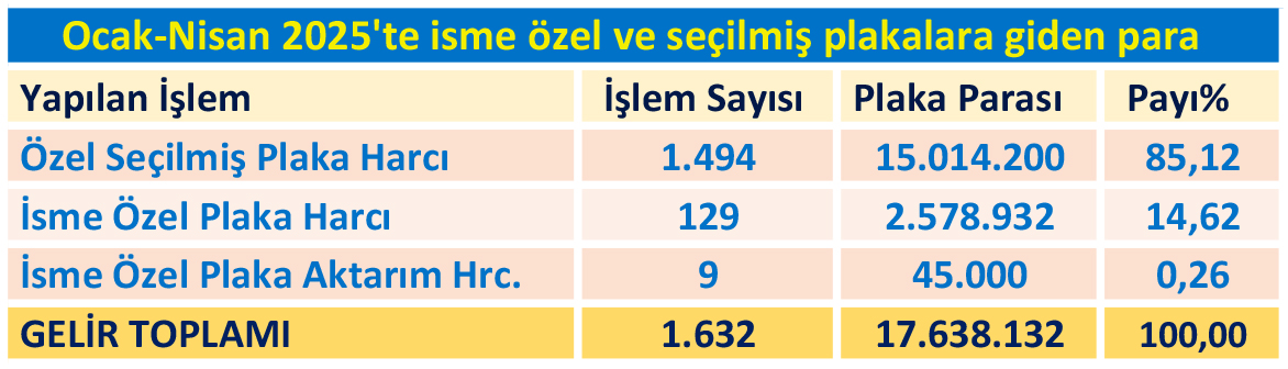 Bayındırlık ve Ulaştırma Bakanlığı verilerine göre, Ocak-Nisan 2025 döneminde “özel seçilmiş sıradan plakalar” ile “isme özel plakalar” için yapılan bin 632 (1,632) işlem için 17 milyon 639 bin lira ödendi. Araç Kayıt Dairesi bu dönemde bin 494 (1,494) “Özel seçilmiş sıradan plaka” işlemi yaptı. Bu işlemleri yaptıran kişiler toplamda 16 milyon 014 bin lira öderken, işlem başına alınan ücret 10 bin 050 lira oldu. Veriler, 4 aylık dönemde “İsme özel plaka” meraklılarının ise 129 işlem için 2 milyon 578 bin lira ödediğini gösteriyor. İsme özel plakaların birim maliyeti ise 19 bin 990 TL oldu.