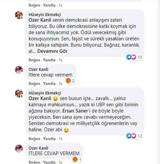 Bayrak Radyo Televizyon Kurumu Yönetim Kurulu Başkanı Özer Kanlı ile Haber Kıbrıs Genel Yayın Yönetmeni Hüseyin Ekmekçi sosyal medya üzerinden birbirlerine ağır laflar kullandı. Kıbrıs Türk basınının iki önemli ismi birbirlerine ağır hakaretlerde bulunurken Hüseyin Ekmekçi, Özer Kanlı için “Sen faşist ve sürekli yasaklar üreten bir kafaya sahipsin”dedi. Buna karşın Özer Kanlı, Hüseyin Ekmekçi’yi işaret ederek “itlere cevap vermem” diyerek tartışmayı alevlendirdi. Sosyal medya üzerinden yapılan tartışma çok sayıda sosyal medya takipçisinin dikkatini çekti. Bilindiği gibi geçtiğimiz yayın döneminde BRT’de Damla Soyalp’ın moderatörlüğünde ve Hüseyin Ekmekçi Rasih Reşat, Artun Çağa ve Cenk Mutluyakalı’nın katılımı ile gerçekleşen Basın Odası isimli program Özer Kanlı’nın talimatı ile yayından kaldırılmıştı.