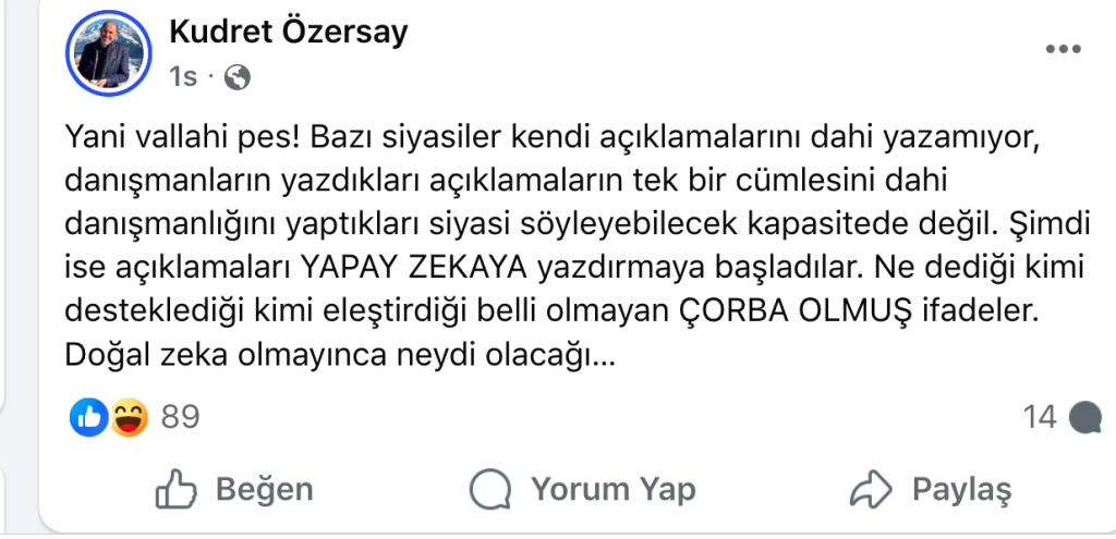 Özersay, bazı siyasilerin kendi açıklamalarını dahi yazamadığını, danışmanlar tarafından hazırlanan metinleri dahi savunabilecek kapasitede olmadıklarını öne sürdü. Açıklamaların artık yapay zekaya yazdırıldığını iddia eden Özersay, ortaya “ne dediği, kimi desteklediği, kimi eleştirdiği belli olmayan çorba olmuş ifadeler” çıktığını savundu.