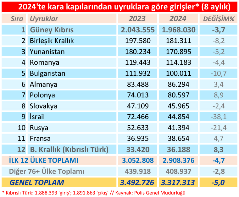 Kuzey Kıbrıs’a 2024 yılının 8 aylık döneminde kara kapılarını kullanarak giriş yapan Kıbrıslı Rumların ve “yabancıların” sayısı, bir önceki yılın aynı dönemine göre %5 oranında azaldı. Ocak-Ağustos döneminde kara kapılarından giriş sayısı (Kıbrıslı Türkler hariç) 3 milyon 317 bin 313 girişe geriledi. 2023’ün aynı döneminde giriş sayısı 3 milyon 492 bin 726 idi. 2024’teki bu sayıya, Güney’den Kuzey’e dönen “KKTC” uyrukluların 1 milyon 968 bin 030 adetlik geçişi de dahil edilince “tüm girişler” 5 milyon 205 bin 706’ya ulaşıyor. Bu periyottaki çıkış sayısı ise 5 milyon 196 bin 815 seviyesinde oldu.