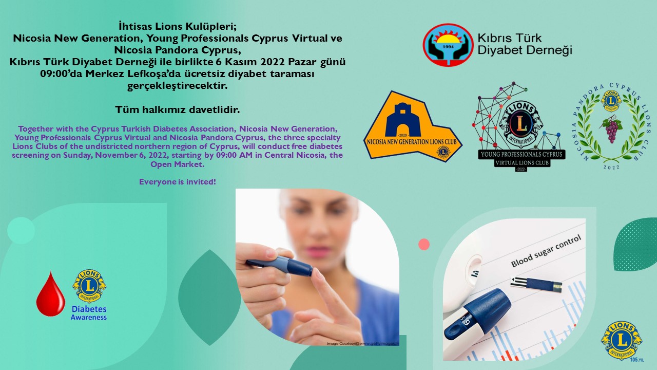 İhtisas Lions Kulüpleri Nicosia New Generation, Young Professionals Cyprus Virtual ve Nicosia Pandora Cyprus Kulüpleri, tarafından pazar günü ücretsiz şeker taraması yapılacak.