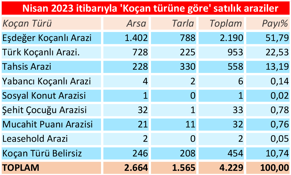 GIYNIK Property’nin yaptığı piyasa analizine göre satışa çıkarılan arazilerin %51.79’una denk gelen 2 bin 190 adedinin “eşdeğer koçanlı” olduğu dikkati çekiyor. Bu rakamlara %13.19 (558 adet) oranındaki “tahsisli araziler” de eşdeğerlere eklenince, satılıkların %64.9’unun; “Türk koçanlı olmayan” arazilerden oluştuğu görülüyor. Bu oran Aralık 2021’de de %77.2; Haziran 2022’de %71.7; Mart 2023’te de %65.4 düzeyindeydi. Piyasadaki satılık “Türk koçanlı” arazi sayısı 950 olarak saptanırken, piyasa payı da %22.5 düzeyinde hesaplandı.