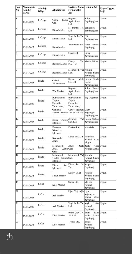 Tarım Dairesi 6 ilçede market, otel, restaurant ve Girne pazarında yaptığı zeytin yağı denetimlerinde 1 adet tağşişli ürün bulduğunu açıkladı.