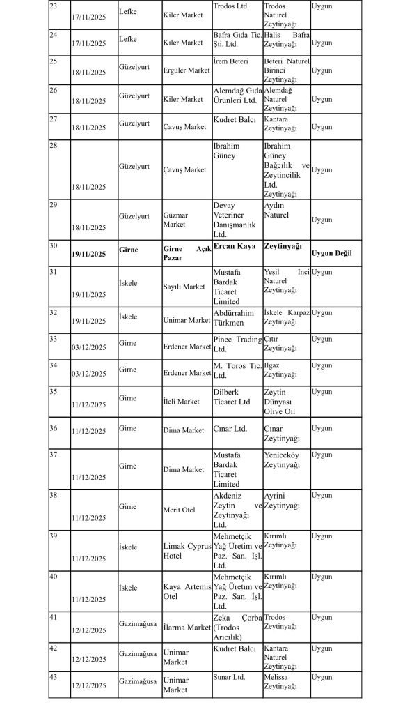Daireden yapılan açıklamaya göre, 13 Kasım-12 Aralık 2025 döneminde kayıtlılık, etiket ve hijyen kurallarına bakılıp, tağşiş analizi için alınan 43 zeytinyağı numunesinin 42’si uygun bulunurken, 1’inin de tağşişli olduğu saptandı. Tağşişli ürün sattığı tespit edilen üretici hakkında yasal işlem başlatıldı.