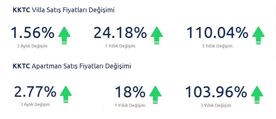 Kuzey Kıbrıs genelinde Temmuz-Eylül 2024 döneminde tüm emlak fiyatlarının artış gösterdiği hesaplandı. Satılık ve kiralık konutların bölgelere göre metrekare fiyatları ve fiyat değişimlerini içeren Reidin Data Analytics iş birliği ile oluşturulan “101evler Emlak Endeksi 2024, 3. Çeyrek” verilerine göre, bazı bölgelerde fiyatlar az da olsa geriledi. Ancak, ortalama fiyatlar yükselmeye devam etti. Son 3 ayda ülke genelindeki satılık dairelerin fiyatlarında %2.77, satılık villalarda ise %1.56 oranında artış görüldü.