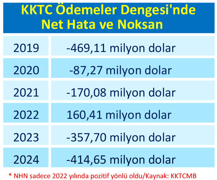 KKTC’nin Ödemeler Dengesi istatistiklerine göre 2024 yılında “net hata ve noksan” (NHN) kalemi “-414,65 milyon dolar” düzeyinde hesaplandı. 2023 yılında “-357,70 milyon dolar” olan NHN, ekonomiye giren ya da çıkan ancak, resmi kayıtlarda kaynağı ve yönü net olarak izlenemeyen para hareketlerini ifade ediyor. Bu kalemin yüksek olması ekonomide “kayıt dışı para trafiğinin” arttığını gösteriyor. KKTC Merkez Bankası ile İstatistik Kurumu’nun ortak çalışmasıyla 2025’in son ayında açıklanan 2024 yılına ait ödemeler dengesi verileri, NHN’yi “negatif” yönlü gösteriyor. Net hata ve noksanın eksi (negatif) olması ise ülkeye gelen dövizden daha fazlasının resmi kayıtlara girmeden ülkeden kaçtığına işaret ediyor.