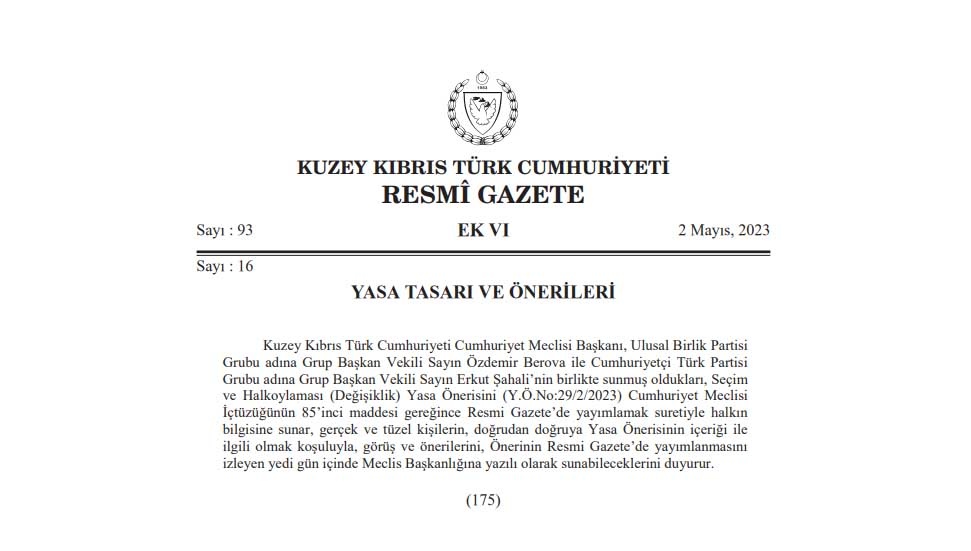 Ulusal Birlik Partisi Grubu adına Grup Başkan Vekili Özdemir Berova ile Cumhuriyetçi Türk Partisi Grubu adına Grup Başkan Vekili Erkut Şahali’nin birlikte sunmuş oldukları Seçim ve Halkoylaması (Değişiklik) Yasa Önerisi (Y.Ö.No:29/2/2023) Cumhuriyet Meclisi İçtüzüğünün 85’inci maddesi gereğince Resmi Gazete’de yayımlanarak halkın bilgisine sunuldu
