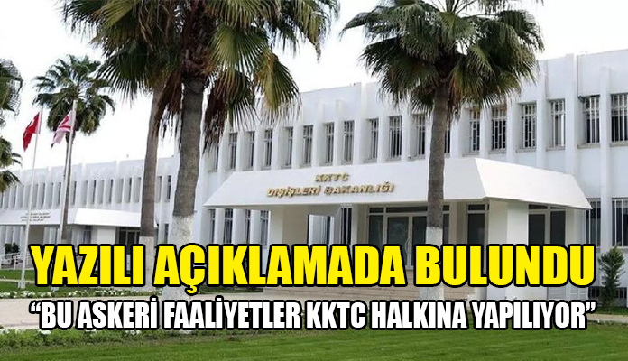 Dışişleri Bakanlığı'ndan yapılan açıklamada, Güney Kıbrıs'ın bazı ülkeler ile askeri faaliyetlerde bulunmasına işaret edilerek, "Rum tarafının kışkırtıcı faaliyetleri endişe verici bir boyuta ulaşmıştır. Bu askeri faaliyetlerin Kıbrıs Türk halkına karşı yapıldığı açıktır." denildi