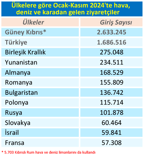 KKTC’yi geçtiğimiz yılın Ocak-Kasım döneminde havadan, denizden ve karadan ziyaret eden kişilerin toplam giriş sayısının 6 milyon 513 bin 985 olduğu hesaplandı. Hava ve deniz limanlarından gelen 1 milyon 685 bin 516 Türkiye Cumhuriyeti vatandaşı gelirken, Kıbrıslı Rumlar; 2 milyon 627 bin 542’si kara kapıları, 5 bin 703’ü limanlar olmak üzere 2 milyon 633 bin 245 giriş yaptı. Kıbrıslı Rumlar ile Türkiye vatandaşları hesap dışı bırakıldığında ise yabancıların kara kapılarından yaptığı girişler 1 milyon 874 bin 979; hava ve deniz limanlarından yaptıkları girişler ise 319 bin 245 olarak saptandı.
