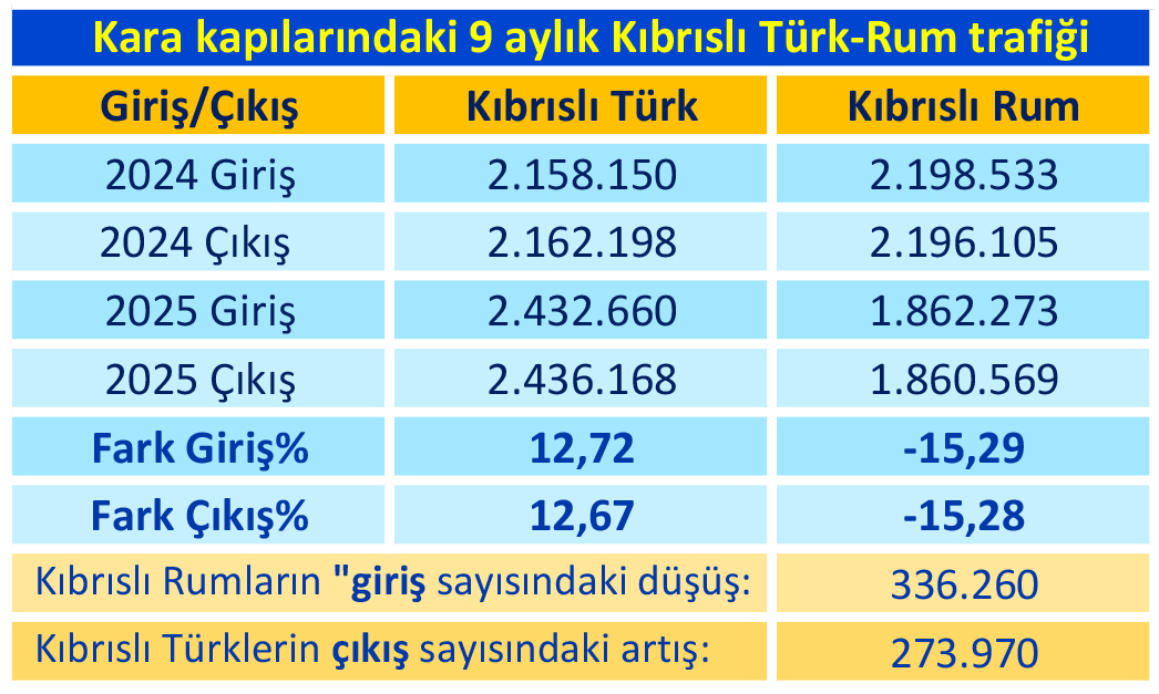 Kıbrıslı Türklerin 2025 yılının dokuz aylık döneminde Güney Kıbrıs’a geçiş için kara kapılarını kullanarak yaptıkları çıkışların sayısında geçen yıla göre çeyrek milyondan fazla artış var. Aynı sürede Kuzey’e giriş yapan Kıbrıslı Rumların sayısı ise çok sert düştü. Geçen yıla göre Rumların geçiş sayısında 336 binlik düşüş, Türklerin çıkış sayısında ise 274 binlik artış saptandı. Rumlar, Ocak-Eylül 2024 döneminde 2 milyon 190 bin 533 giriş yaparken, 2025’in aynı dönemindeki girişleri %15.3 oranında düşüşle 1 milyon 862 bin 273’e geriledi. Aynı dönemde, “diğer ülke vatandaşlarının” giriş sayısı da %2.3 oranında azalarak, 1 milyon 537 binden, 1 milyon 501 bin indi.