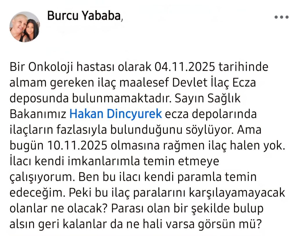 ​Yababa sosyal medyadan yaptığı paylaşımla; “Sayın Sağlık Bakanımız Hakan Dinçyürek ecza depolarında ilaçların fazlasıyla bulunduğunu söylüyor. Ama bugün 10.11.2025 olmasına rağmen ilaç halen yok. İlacı kendi imkanlarımla temin etmeye çalışıyorum. Ben bu ilacı kendi paramla temin edeceğim. Peki bu ilaç paralarını karşılayamayacak olanlar ne olacak? Parası olan bir şekilde bulup alsın geri kalanlar da ne hali varsa görsün mü?” sözlerini kaydetti.