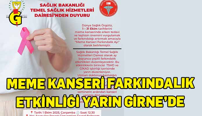 Sağlık Bakanlığı, Meme Kanseri Farkındalık Ayı nedeniyle yarın Girne Acapulco Resort Convention Grand Ballroom’da etkinlik düzenliyor. Temel Sağlık Hizmetleri Dairesi ile GİKAD tarafından düzenlenecek etkinlik saat 12.30’da başlayacak.