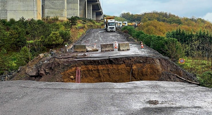 Uskumruköy’de, viyadüğün altındaki inşaat alanında derenin üzerinden geçen yolda yağışın etkisiyle çökme meydana geldi.