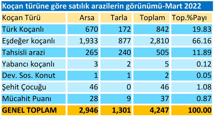 3’TE 2’Sİ EŞDEĞER STATÜSÜNDE… Satışa çıkarılan arsa ve tarlaların %66.16’sına denk gelen 2 bin 810 adedinin “eşdeğer koçanlı” olduğu dikkati çekiyor. Verilere göre %11.89 (505 adet) oranındaki “tahsisli araziler” (koçan statüsü belirsiz) de eşdeğerlere eklenince, satılıkların %78.05’inin “Türk koçanlı olmayan” arazilerden oluştuğu görülüyor. Piyasada satılık pozisyonunda bulunan “Türk koçanlı” arazi sayısı 842’ye çıkarken payı %19.83 düzeyine yükseldi. İlanlara göre ayrıca, “Mücahit puanıyla” elde edilen arazilerden 37 âdeti, “Şehit çocuklarına” verilen arazilerin de 46 adedi şu anda satılık.