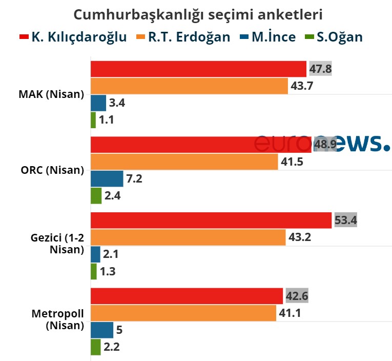 * Euronews’un konuyla ilgili haberine göre, Gezici’nin 1-2 Nisan’da yaptığı ankette Kılıçdaroğlu %53.4 oy alırken Erdoğan %43.2’de kalıyor. Muharrem İnce %2.1; Sinan Oğan ise %1.3 oy alıyor. Seçimin ikinci tura kalması halinde ise Kılıçdaroğlu %55.2’de; Erdoğan %44.8’de görülüyor.