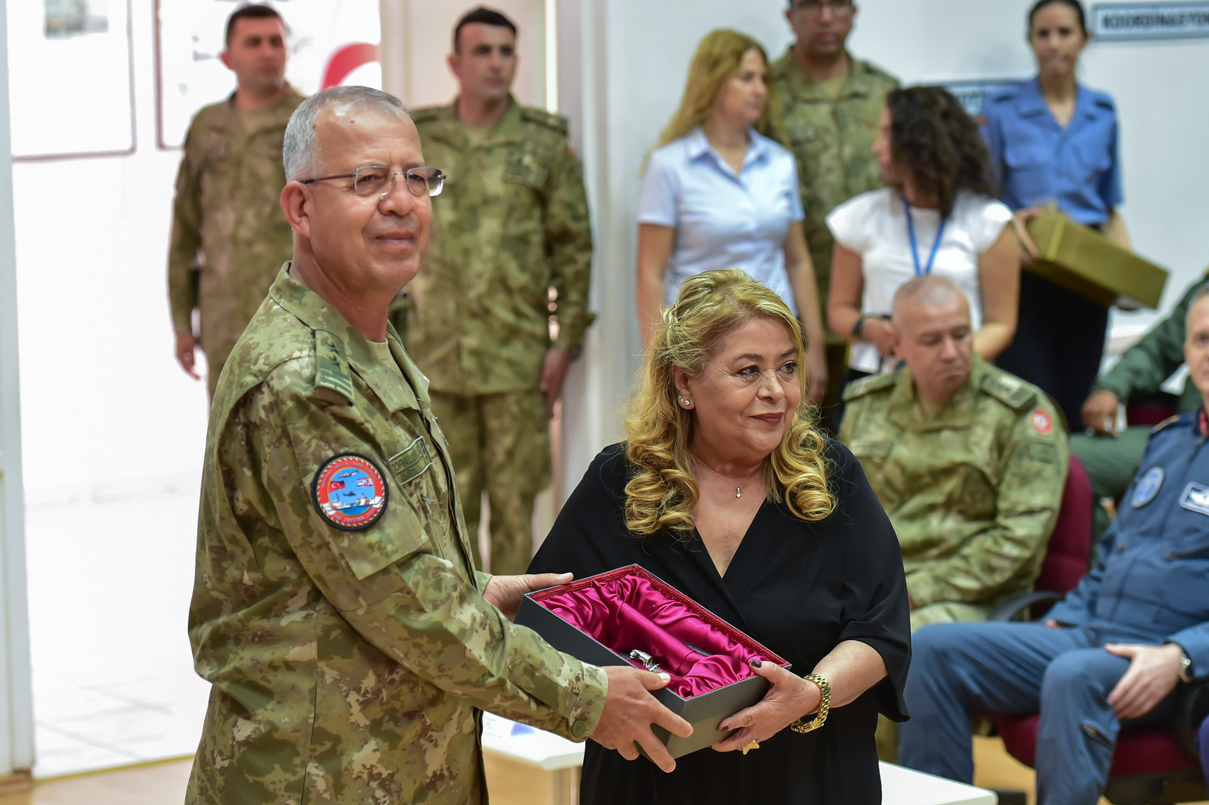 Daha sonra GKK Komutanı Tümgeneral Zorlu Topaloğlu ve TC Sahil Güvenlik Komutanı Tümamiral Ahmet Kendir tarafından Şehit Teğmen Caner Gönyeli’nin eşi Nükhet Gönyeli’ye tatbikat anı objeleri takdim edildi.