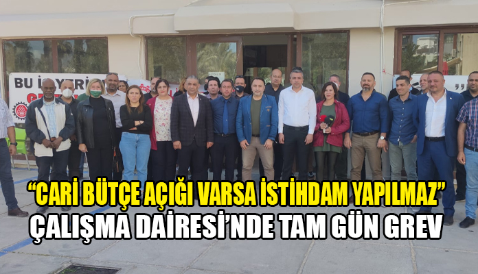 Çalışma Dairesi’nde örgütlü Kıbrıs Türk Amme Memurları Sendikası (KTAMS), Kıbrıs Türk Kamu Görevlileri Sendikası (Kamu-Sen), Kamu İşçileri Sendikası (Kamu-İş) ve Eşit Hak ve Adalet Sendikası (HAKSEN) bugün dairede tam gün greve gitti.