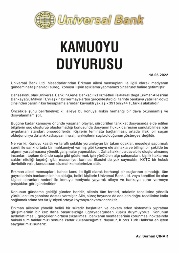 Universal Bank Ltd. hissedarlarından Erkman ailesinin avukatı Serhan Çınar, medyanın gündemine taşınan adli süreç hakkında yazılı bir açıklama yaparak, Erkman ailesine yönelik sistematik bir yıpratma girişimi başlatıldığını dile getirdi.
