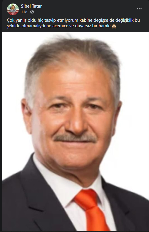 “Çok yanlış oldu hiç tasvip etmiyorum” diyen Tatar, “Kabine değişse de değişiklik bu şekilde olmamalıydı ne acemice ve duyarsız bir hamle” şeklinde tepkisini dile getirdi.