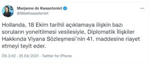 ABD, Hollanda ve Kanada Büyükelçilikleri bugün resmi twitter hesaplarından “Viyana Sözleşmesinin 41. Maddesine bağlılıklarını” dile getirmişler, imzacı diğer ülkelerin Büyükelçileri de benzer açıklamalarda bulunup ABD Elçiliğinin mesajını retweet etmişlerdi.