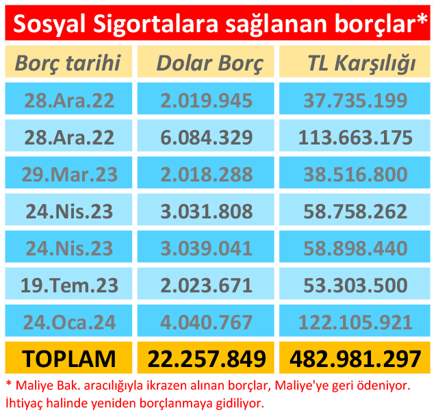 Merkez Bankası’ndan yapılan duyuruda, alınan borcun aynı şartlarda geri ödenmesi için Sosyal Sigortalar Dairesi ile Maliye Bakanlığı arasında İkraz Sözleşmesi imzalandığı bilgisine de yer verildi. Sigortalar için dolar cinsinden ilk borç Aralık 2022’de alınırken, bu süreçte 7 kez iç borçlanmaya gidildi. Maliye, Sosyal Sigortalar için ayrıca 2023 yılı içinde 19 Temmuz’da 2 milyon 023 bin dolar; 24 Nisan’da 6 milyon 070 bin dolar; 29 Mart’ta 2 milyon 018 bin dolar; 28 Aralık 2022’de de 8 milyon 104 bin dolar borç sağlamıştı. Bu borçlanmaların vadesi gelen kısmının ikraz sözleşmesiyle geri ödendiği biliniyor.