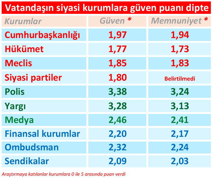 CMIRS’in 500 kişiyle yüz yüze anket yöntemiyle yaptığı araştırmada, halkın siyasilere yönelik olumsuz tavrı, kendisini en çok güven duyduğu kurumlarda da gösteriyor. Çalışmaya göre toplumun en çok güven duyduğu 3 kurum sırasıyla polis, yargı ve medya oldu. En az güven duyulan kurumlar ise bu dönemde değişerek sırasıyla 1. Hükümet; 2. Siyasi Partiler; 3. Meclis; 4. Cumhurbaşkanlığı oldu. Araştırmada, medya güven listesinde yukarılara çıkarken, siyaset kurumunun iyice dibe yerleştiği ortaya çıktı. Cumhurbaşkanlığının ülke tarihinde “ilk kez” en az güven duyulan kurumlar arasında anılması ise ülke siyaseti adına düşündürücü sonuçlardan birini oluşturdu.
