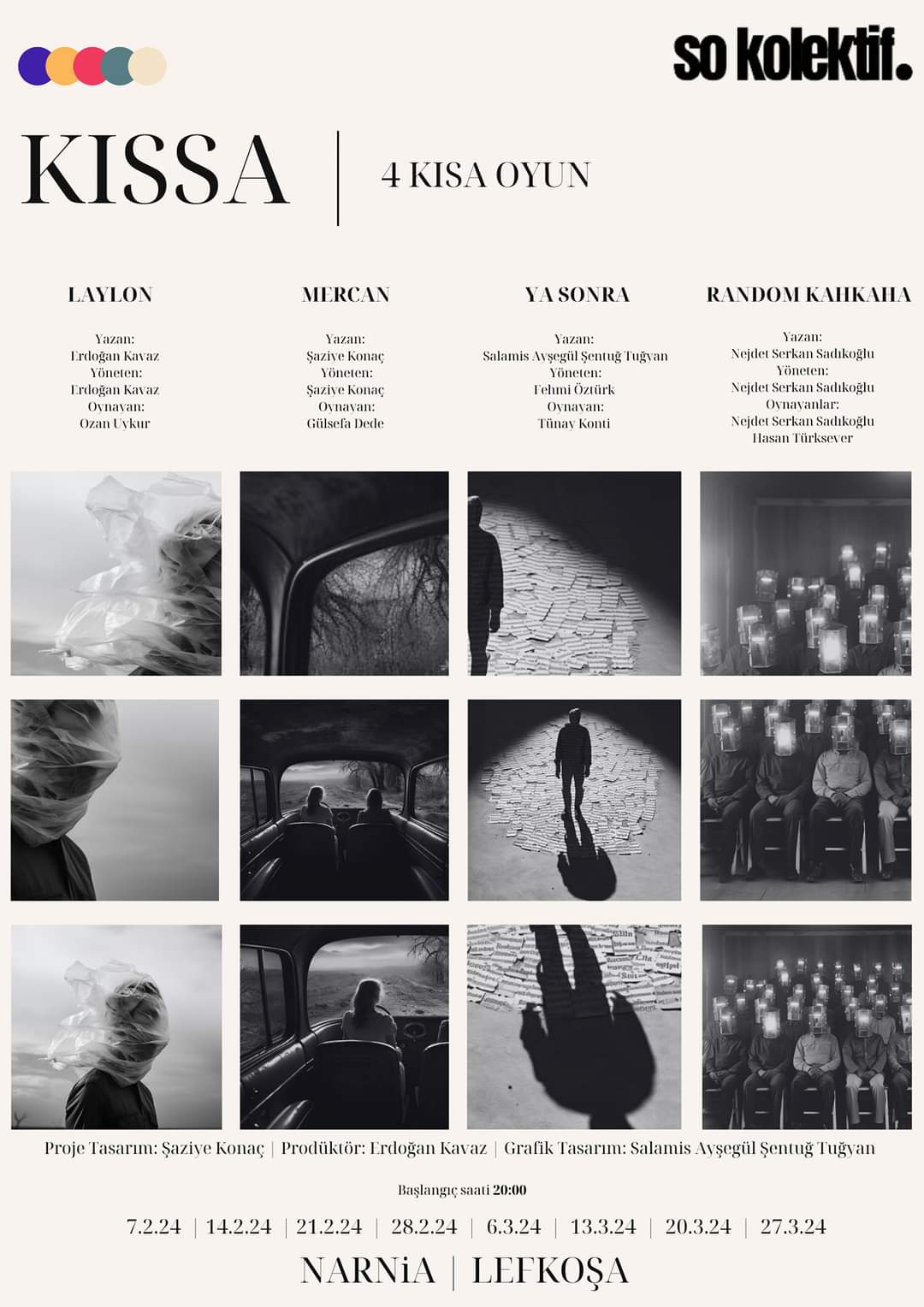 So Kolektif tiyatro ekibinin “KISSA” adlı tiyatro oyunu Dünya Tiyatro Günü nedeniyle 27 Mart Çarşamba günü Narnia’da son gösterimini yapacak. Dört yazarın bir araya gelerek yazdığı KISSA adlı tiyatro projesi, 4 kısa oyundan oluşurken, 4 farklı yönetmen tarafından yönetildi. Lefkoşa’daki etkinlik boyunca art arda dörder defa oynanan oyunlar bilet üzerinde belirtilen numara sırasına göre izleniyor.