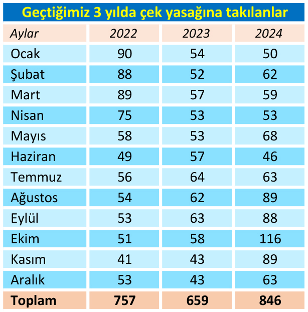 Merkez Bankası’nın verileri 2024’ün ilk çeyreğinde (Ocak-Mart) 171 kişinin; ikinci çeyreğinde (Nisan-Haziran)167 kişinin; üçüncü çeyreğinde (Temmuz-Eylül) 240 kişinin ve dördüncü çeyreğinde (Ekim-Aralık) 268 kişinin “çek kullanmaktan men edildiğini” gösteriyor. Veriler her ay ortalama 70,5 kişinin yasağa düştüğüne işaret ediyor.